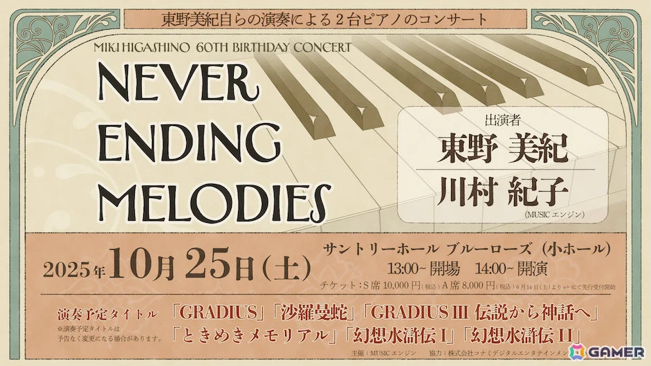 🎵 To celebrate composer Miki Higashino’s 60th birthday, MUSIC Engine will host a special concert titled “NEVER ENDING MELODIES MIKI HIGASHINO 60TH BIRTHDAY CONCERT” on October 25, 2025, at Suntory Hall’s Blue Rose (Small Hall) in Tokyo. Known for composing for numerous iconic KONAMI titles such as Gradius, Salamander, and the HD-remastered Suikoden and Suikoden II, Higashino remains beloved by fans worldwide.