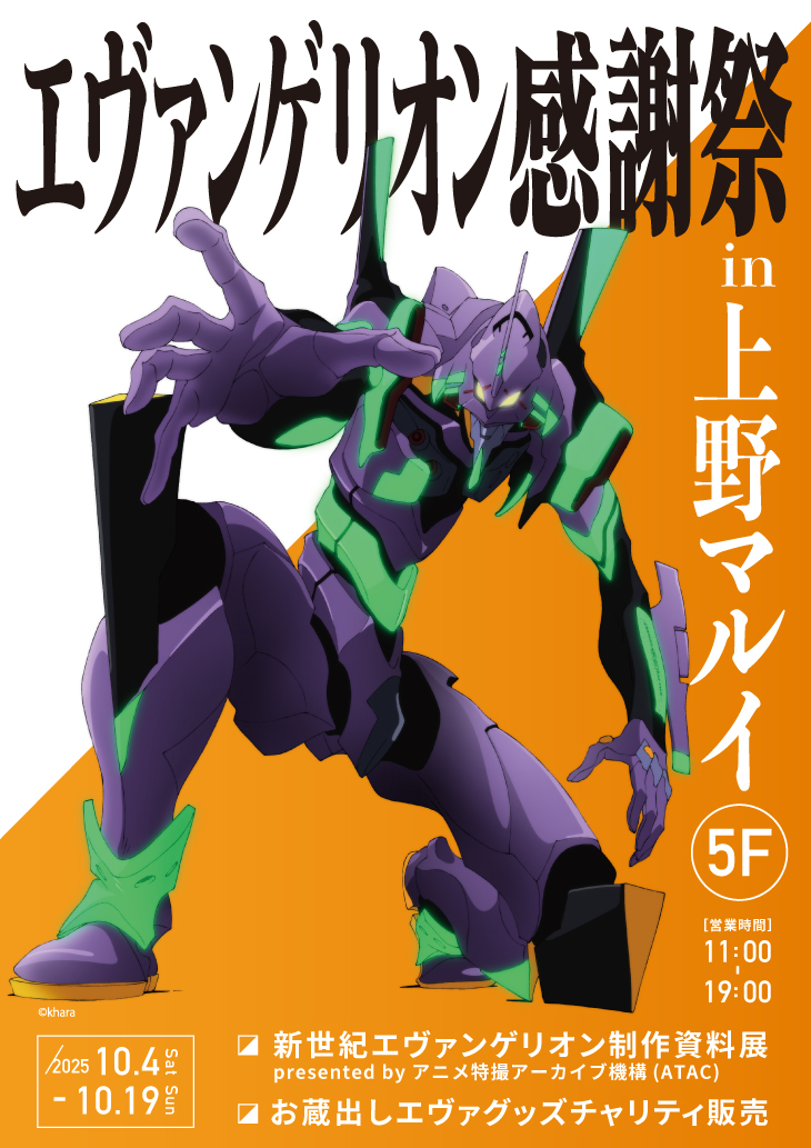 🧡エヴァンゲリオン感謝祭 in 上野マルイ(チャリティ) 🗓️期間:2025/10/4(土)~10/19(日)|⏰営業時間:11:00~19:00|💴入場無料 📍会場:上野マルイ 5F カレンダリウム(東京都台東区) 🛍️内容:『新世紀エヴァンゲリオン 制作資料展』展示+お蔵出しエヴァグッズのチャリティ販売(長期保管品・販売終了品・非売品サンプル等を予定) 🤝寄付:売上の一部をアニメ・特撮の資料保存活動へ寄付 ✅メモ:在庫・購入制限や入場方法は当日案内を確認してね。