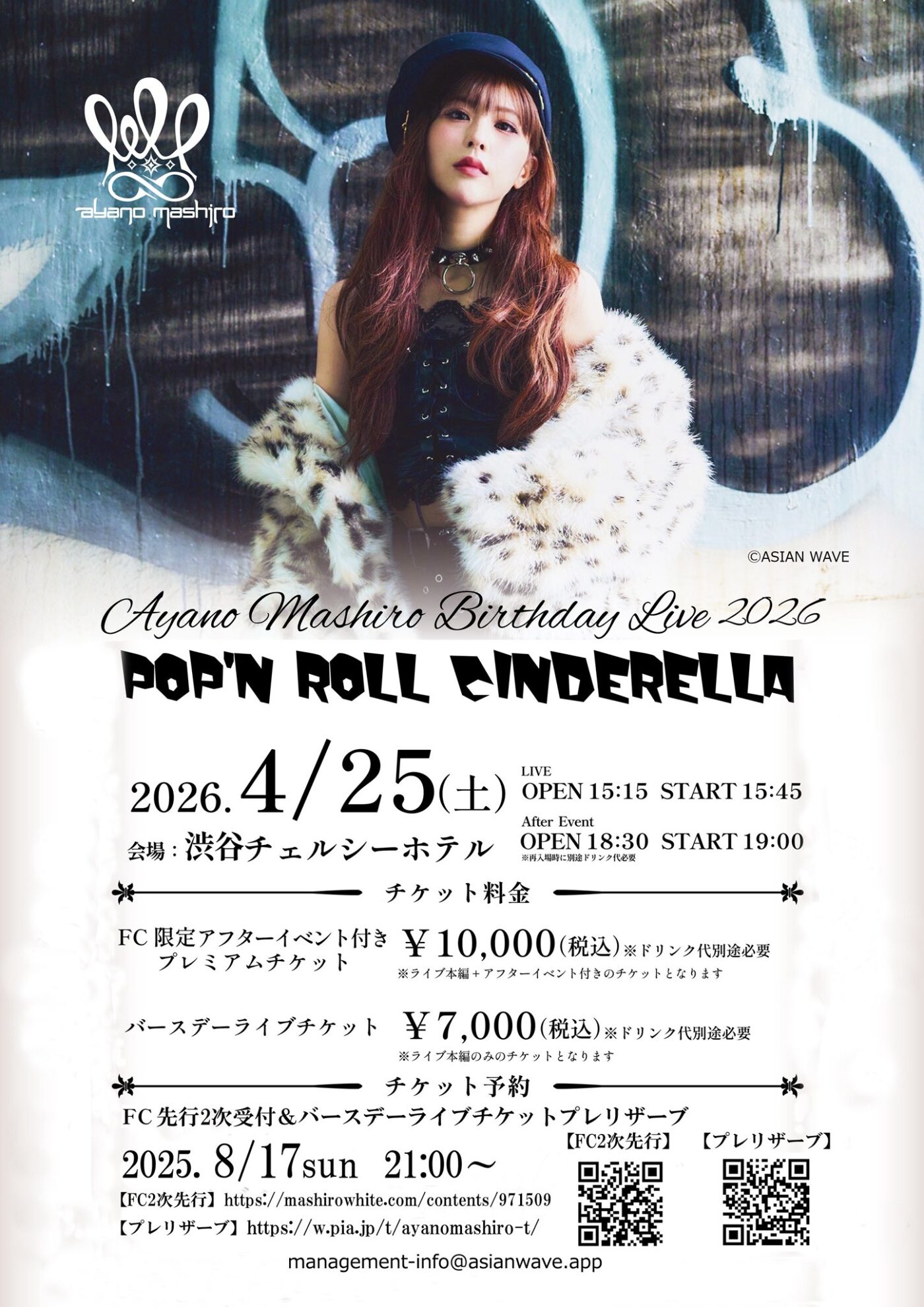 🎂 綾野ましろ バースデーライブ2026『POP’N ROLL CINDERELLA』 🎤 📅 日程2026年4月25日(土) 🏟 会場渋谷チェルシーホテル 🕒 タイムスケジュール LIVE:OPEN 15:15/START 15:45 After Event:OPEN 18:30/START 19:00(※再入場時に別途ドリンク代必要) 🎫 チケット料金 プレミアムチケット(FC限定アフターイベント付き):10,000円(税込) バースデーライブチケット:7,000円(税込)※いずれもドリンク代別途必要 🎟 チケット予約 FC先行2次受付 & バースデーライブチケット プレリザーブ⏰ 2025年8月17日(日)21:00~ ✨ 特別な一夜を一緒にお祝いしましょう!