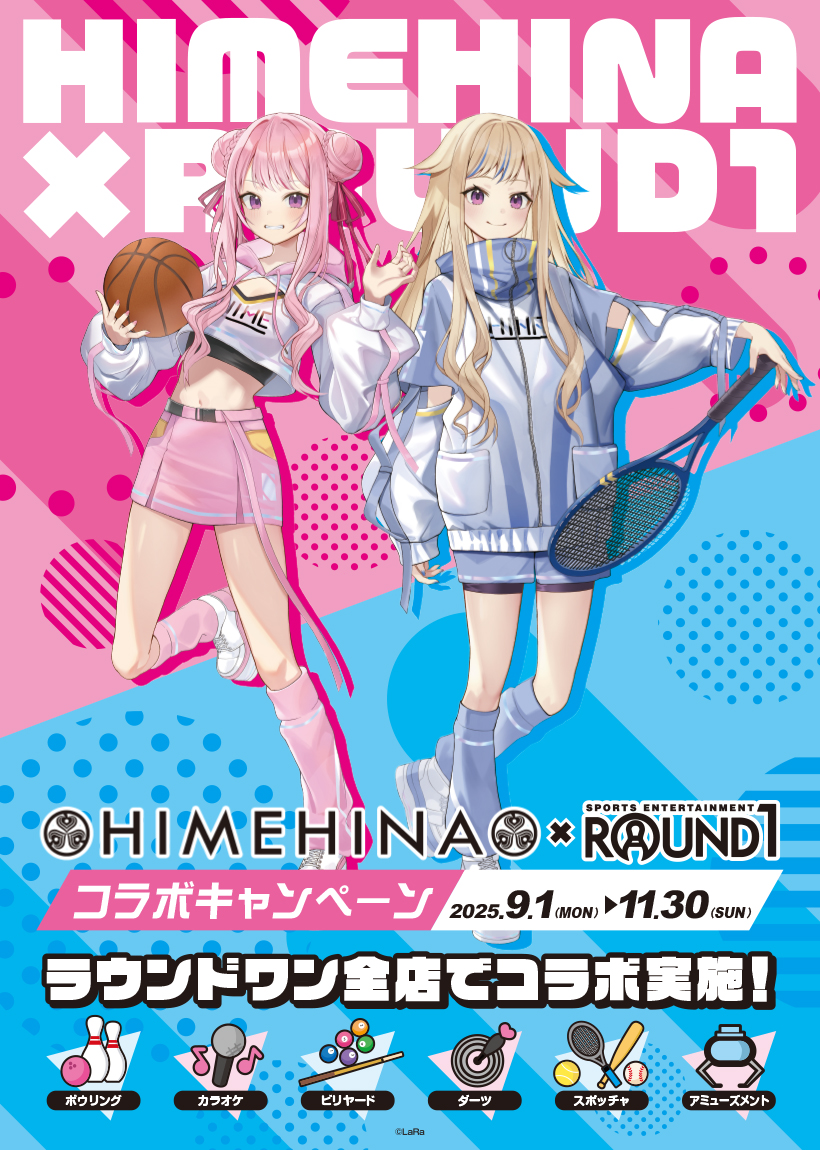 🏀 HIMEHINA × ROUND1 コラボキャンペーン開催! 🎾 📅 実施期間:2025年9月1日(月)10:00 ~ 11月30日(日)📍 開催場所:ラウンドワン全店 ✨ コラボ内容・描き下ろしイラストを使用したキャンペーン展開・ボウリング、カラオケ、ビリヤード、ダーツ、スポッチャ、アミューズメントでの特別企画・ここでしか手に入らない限定特典も登場予定! 🎤 HIMEHINAと一緒にラウンドワンで盛り上がろう!全国で楽しめる特別コラボをお見逃しなく!