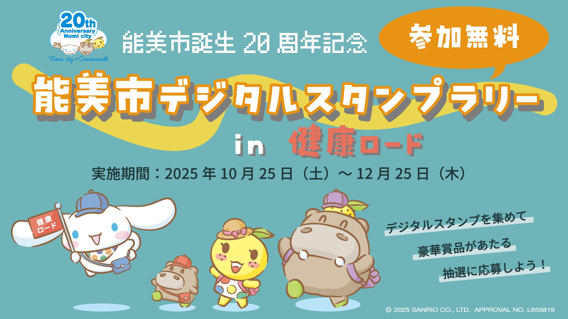 ซินามอโรลทำหน้าที่ทูตสนับสนุน✨ เพื่อฉลองครบรอบ 20 ปีการก่อตั้งเมืองโนะมิ มีการจัดดิจิทัลแสตมป์แรลลี่ตาม “เฮลธ์โรด” และตามสถานี/สถานที่ต่าง ๆ ทั่วเมือง สะสมแสตมป์แล้วร่วมลุ้นของรางวัลสุดพิเศษ♡