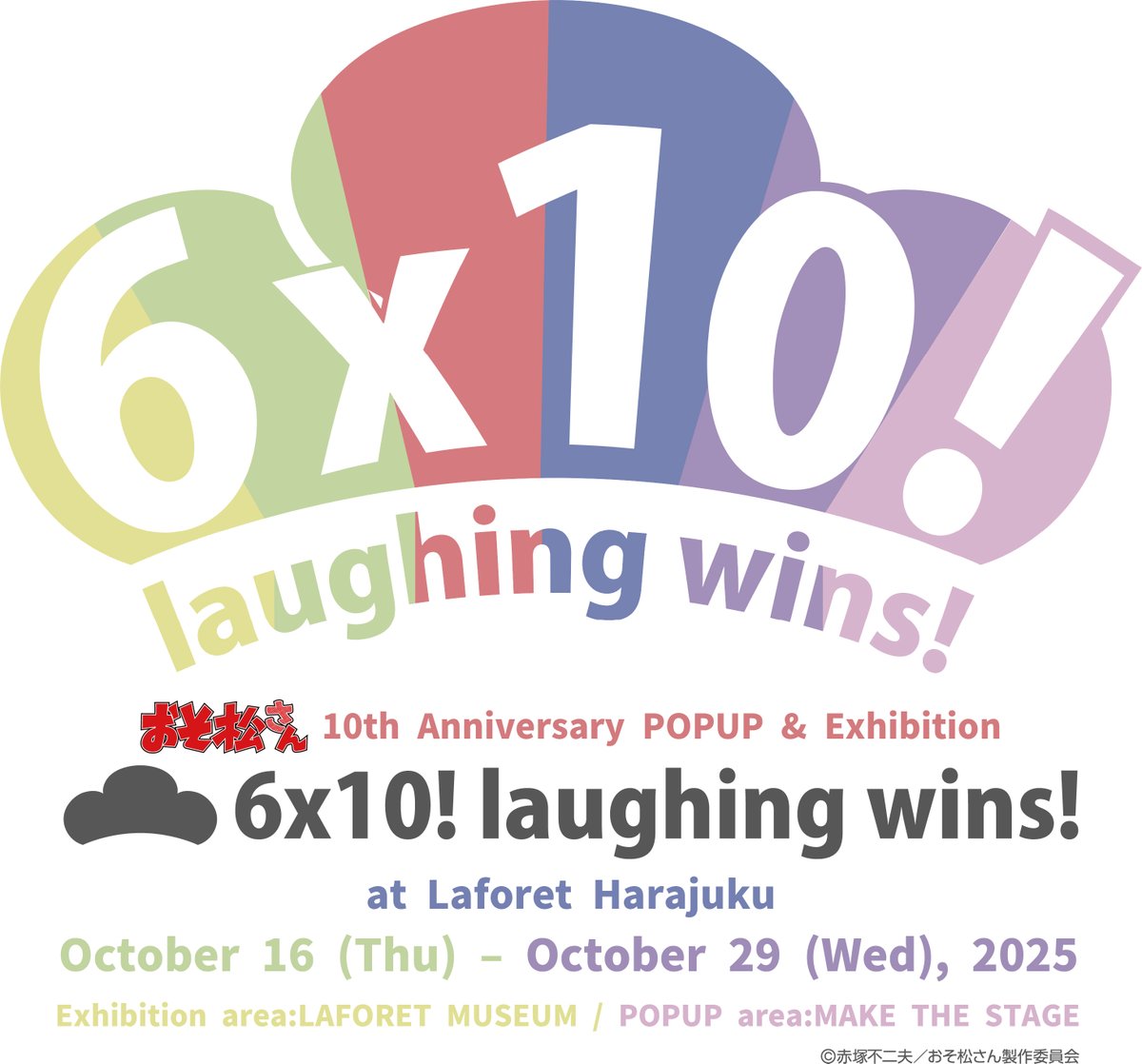 《阿松》10週年紀念活動 6×10! laughing wins! in Laforet原宿 2025 🎉🗓️ 期間:2025年10月16日(四)~10月29日(三)📍 會場:Laforet原宿✨ 內容:回顧10年的企劃/充滿驚喜與笑點的巧思/與參展品牌的合作企劃🛍️ 特徵:在 Laforet原宿 全面支援下的「還挺大的活動」📣 資訊:詳細將於官方網站・SNS 陸續公布