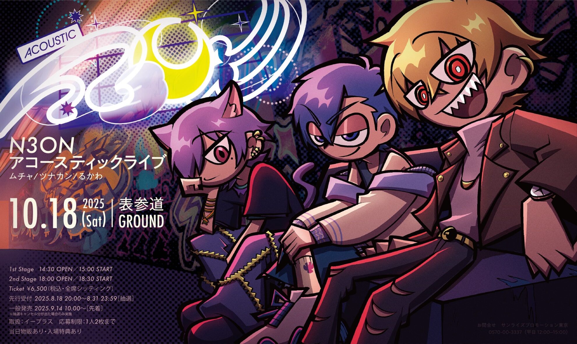 🎶 『N3ON 原声演唱会』2025 📍 会场:表参道GROUND📅 日期:2025年10月18日(周六) 🎤 出演:姆恰/津纳堪/流川 🕒 日程 第一场:入场 14:30/开演 15:00 第二场:入场 18:00/开演 18:30 🎫 门票 全席指定:含税 ¥6,500 先行报名(抽选):2025年8月18日 20:00 ~ 8月31日 23:59 一般发售(先到先得):2025年9月14日 10:00~ 限购:每人至多2张 当日周边贩售/入场特典