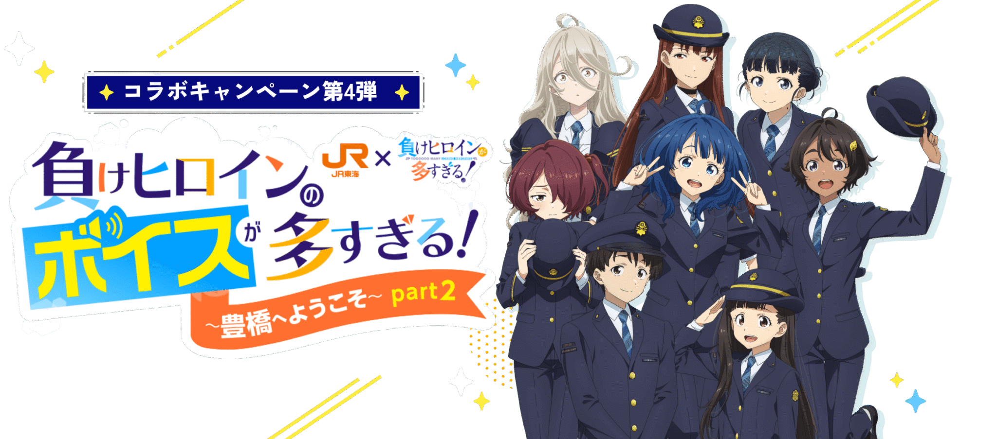 JR东海 ×《败犬女主太多了!》 第四弹合作确定举办!2025~“败犬女主的声音太多了!”~欢迎来到丰桥~ Part2~ 📅 举办期间2025年10月3日(星期五)~12月25日(星期四) 🚄 东海道新干线车内限定内容 雨森焚火老师全新撰写!原创语音剧上线 获取乘车证明即可获赠纪念品(A5透明文件夹、可自选的透明书签) 🏙 在圣地・丰桥尽情游玩 市内巡游语音集章活动:一边听语音剧,一边漫游丰桥! 原创周边贩售:使用联动插画的新款周边将提前发售 贩售地点:精文馆书店 丰桥总店 贩售期间:2025年10月3日(星期五)~12月25日(星期四) 丰桥市内装饰:水上大楼壁画装饰/常磐通商店街悬挂旗帜 📢 作品信息《败犬女主太多了!》获第15届小学馆轻小说大奖“GAGAGA奖”。动画第2季制作已确定! 🌟 在圣地・丰桥展开特别合作!乘上新干线、逛遍城市,和“败犬女主”们一起尽情畅玩吧!