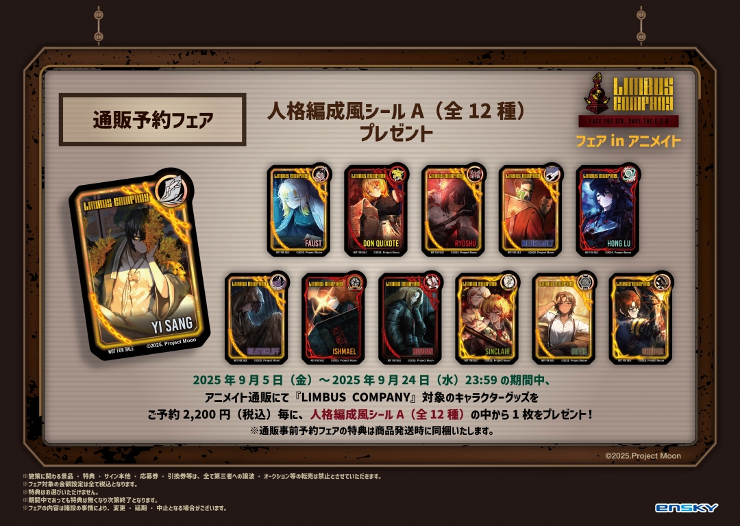 🌀 LIMBUS COMPANY Fair in Animate期间:2025/12/19(周五)~ 2026/01/12(周一)地点:日本全国 Animate 门店(不含网店)内容:每购买含税 2,200日元 的相关角色周边→ 赠送 “人格编成风贴纸B”(共12款)1张图案随机。