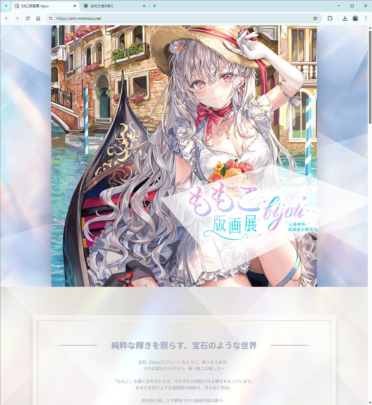 momoco版画展 -bijou-(巡回展)举办!2025 💎 看点以如宝石般“bijou”的少女为主题的版画展。通过官网预约来场可获A4透明海报特典。 巡回日程(摘选) 爱知:9/4(周四)–9/15(周一)|アールジュネス名古屋 静冈:9/5(周五)–9/8(周一)|富士市产业交流展示场 ふじさんめっせ 枥木:9/5(周五)–9/8(周一)|栃木县南地域地场产业振兴中心 山口:9/5(周五)–9/8(周一)|おのだサンパーク 大分:9/12(周五)–9/15(周一)|别府国际会展中心(B-Con Plaza) 京都:9/18(周四)–9/21(周日)|南丹市国际交流会馆 东京(池袋):10/3(周五)–10/5(周日)|池袋 Sunshine City 青森:10/3(周五)–10/6(周一)|青森产业会馆 东京(新宿):10/10(周五)–10/13(周一)|新宿Island 兵库:10/24(周五)–10/27(周一)|永旺梦乐城神户北 预约从网页预约页面进行来场预约可获特典。详情与最新信息请以官方网站为准。
