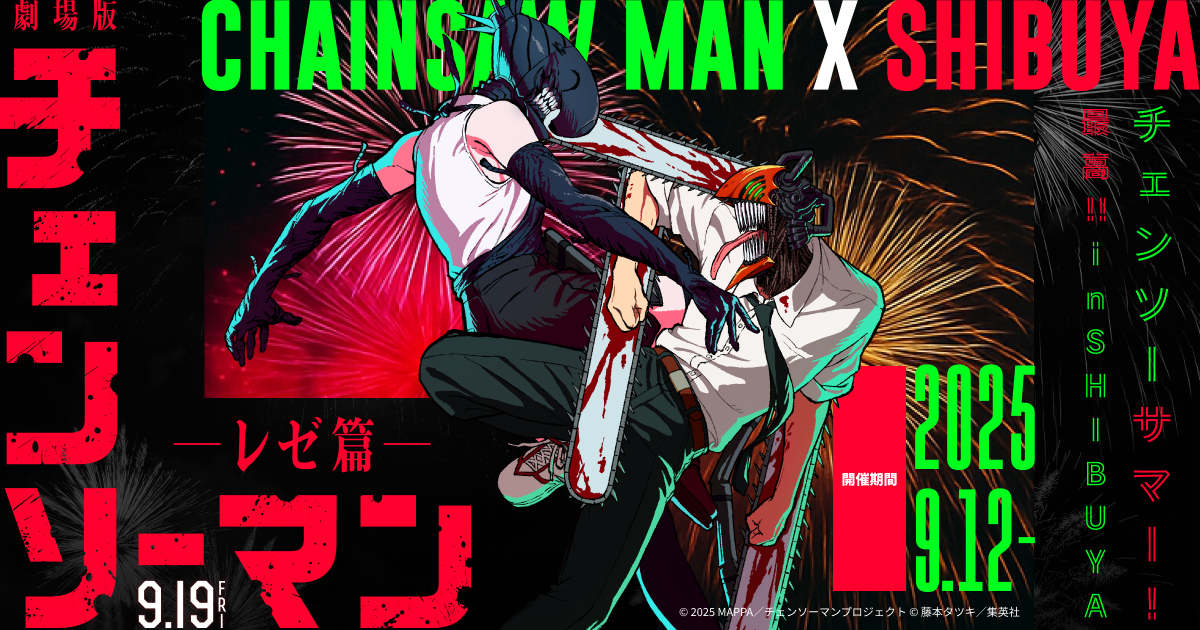 🪚 標題:鏈鋸夏日!最棒!! in SHIBUYA(劇場版《雷賽篇》紀念)🗓 舉辦:2025年9月12日(五)起,以澀谷為中心陸續展開🎁 概要:9家店舖POP UP/服裝聯動/活動/ZONe飲料派發/糖果派發 等 01. POP UP SHOP 🖼 澀谷交差展(BANDAI)|9/23–9/29 ※23日13:00起/其他 11:00–20:00|澀谷區神南1-23-8 🏬 PARCO 6F|9/12–9/28|販售・展示・特典 🎵 Tower Records唱片澀谷店 4F|9/19–9/28|販售・展示・特典 📚 Village Vanguard(澀谷第一勸銀共同大樓 B1・B2)|9/19–10/5|販售・展示・特典 🛒 必客澀谷東口店|9/19–10/5|販售・展示・特典 📀 MAPPA POPUP(澀谷TSUTAYA)|9/16–9/30|販售・展示・特典 🛍 PickUp Rankin 澀谷ちかみち(澀谷站B2F 八公剪票口前)|9/19–9/30|販售・展示・特典 🧷 澀谷LOFT「CHAINSAW MAN PLAZA」|9/19–10/14|間坂大屏・販售・展示・特典 🧩 baseyard tokyo(神宮前)|9/19–2026/1/15|販售・展示・特典 📘 Animate澀谷 3F|9/19–10/13|販售・特典・布置 02. 服裝聯動 👗 Ground Y 澀谷PARCO 2F|9/26起 🎩 CA4LA 澀谷店(神南)|9/19起 03. ABEMA動漫祭 🗓 9/20–9/21|神宮前6-20-10|聲優登台・面板展示