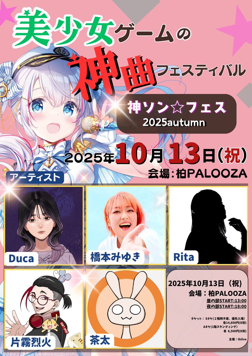 2025年秋季遊戲音樂節 Autumn 🔥出演:Duca/Miyuki Hashimoto/Rita/Rekka Katakiri/Chata舉辦日:2025/10/13(週一・國定假日)會場:Kashiwa PALOOZA概念:那些最想現場聽到的「神曲」,現在重現——遊戲歌曲界傳奇齊聚,奇蹟的一天!POINT 名曲接力,熱度爆表 逢假日舉辦,遠征或跑場都方便 叫上朋友,準備全力應援! 在秋日的柏,徜徉於神曲海洋!
